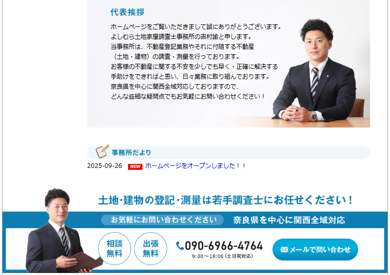 このたび、奈良県よしむら土地家屋調査士事務所 様の新しいホームページ用に、撮影を担当させていただきました。(ホームページ制作オフィスSASAJIMA様よりのご紹介)